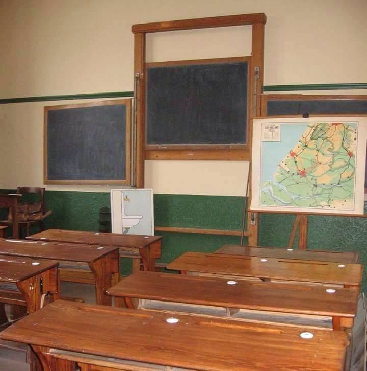 Hiernaast zie je zo'n houten schoolbank. Ze stonden in vier rijen in de klas direct achter elkaar. Wij zaten met 42 kinderen in de klas. Je zat met zijn tweeën in de bank.