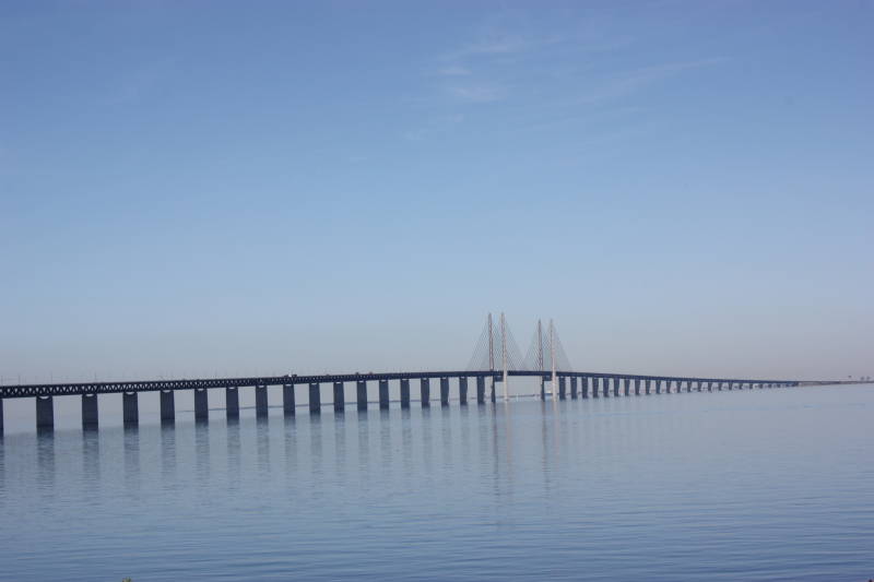 Nadat wij voor de laatste keer onze Hytter netjes en schoon hebben achtergelaten vertrekken wij om half acht met als eindbestemming thuis. Het is vandaag bruggendag. Zijn we de eerste dag met de boot overgestoken naar Noorwegen, vandaag gaan wij via drie bruggen en een tunnel naar het vasteland. Gisteravond hadden we al even uitgedokterd hoe we de Sontbrug ook uit de verte konden zien. Er is zelfs een heel uitkijkpunt voor ingericht. Na bijna twee uur rijden kwamen we daar aan en het resultaat zie je boven. De Sontbrug vormt de verbinding tussen Kopenhagen en Malmö. De grootste overspanning van deze tuibrug is 490 meter. De hoogste pyloon is 204 meter. Naar schatting weegt de brug in totaal 82 miljoen kilogram. De maximale hoogte van het wegdek is 57 meter. Link naar Wikipedia. Er loopt een treinspoor onderdoor.